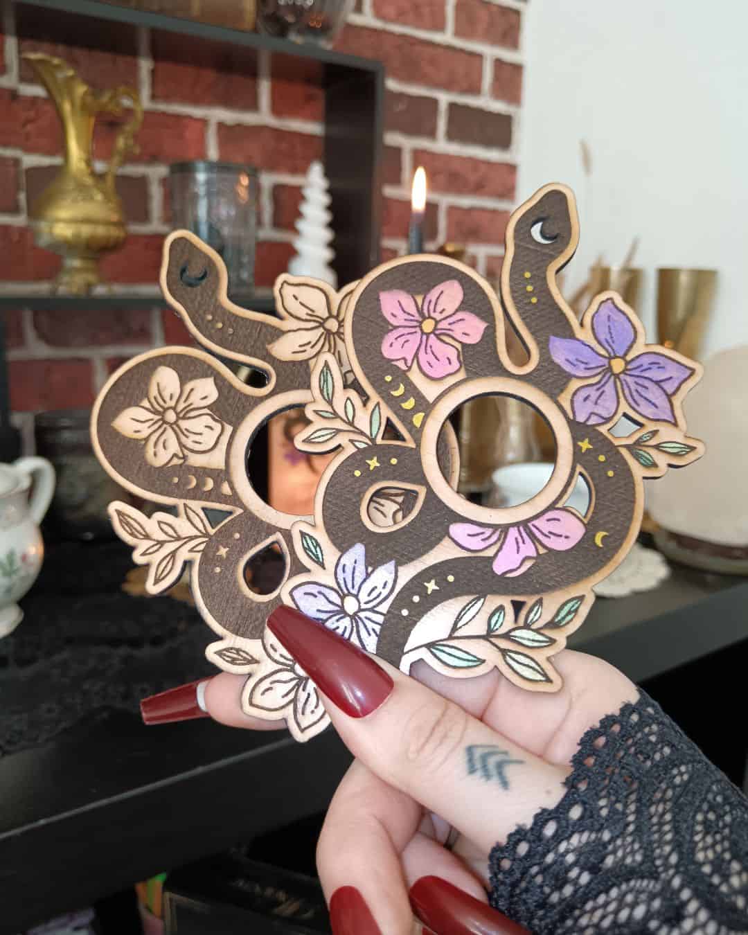 Chaque support est fabriqué artisanalement à la commande, dans mon atelier en Auvergne. Disponible en deux modèles – Serpent Fleuri ou Serpent Feuillu – et en deux finitions : bois brut ou bois teinté à la main, il devient un véritable objet unique.